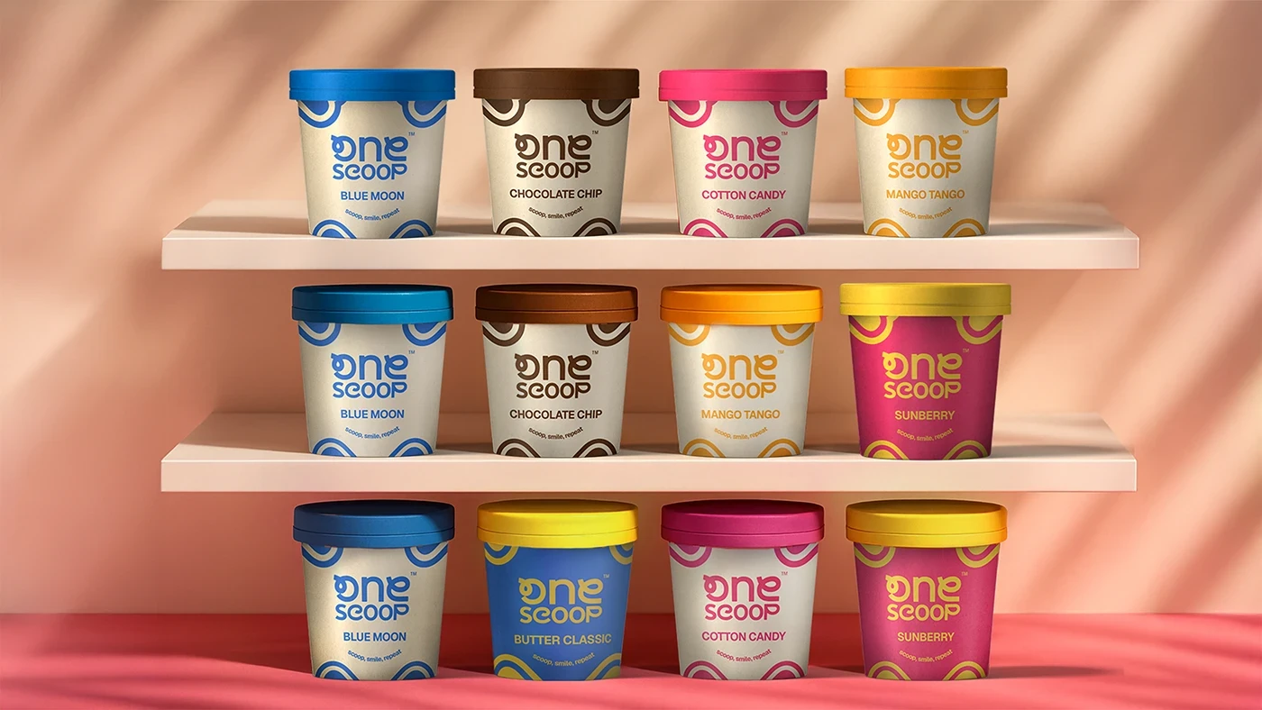 Beyond aesthetics, the One Scoop packaging system was designed for adaptability and consistency across formats. Whether on tubs, labels, or supporting brand touchpoints, the design ensures cohesive expression while allowing room for flavor stories to shine. The result is a packaging identity that not only looks memorable but also communicates the brand’s playful spirit and indulgent promise.